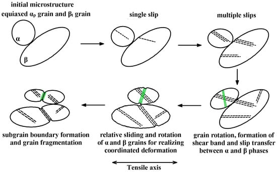To intuitively understand the morphologic evolution of grains and the slip transfer at the grain boundary in the Ti-54432 alloy during tensile deformation, a schematic diagram is drawn as shown in Figure 9. At the beginning of tensile deformation, single slip occurs in the equiaxed αp grains, and the crystallographic orientation of the grains can satisfy the deformation driven by a slight dislocation movement. Subsequently, further deformation leads to the increase of slip lines and the activation of multiple slip systems, and the deformation incompatibility between α and β phases forces the αp grains to rotate [30]. At this time, the dislocation moving to the grain boundary and the change of grain orientation realize the slip transfer from the α phase to β phase, so that the β grains also undergo a dislocation slip-induced deformation [31,32]. Meanwhile, because the β phase has a relatively large number of slip systems [33], some internal dislocations can pass through the phase interface, realizing the slip transfer from the β phase to α phase, so that the deformation incompatibility between two phases can be reduced. When the multiple slips cannot meet the requirement of further deformation, the shear band is formed in the severely deformed αp grain. To coordinate the overall deformation, both α and β grains rotate and slide relative to each other, making that the microvoids are easy to nucleate at the slip band, shear band, and grain boundary [34]. As the deformation continues, the slip band and shear band extend, forming subgrain boundaries and finally splitting grains into several small grains.