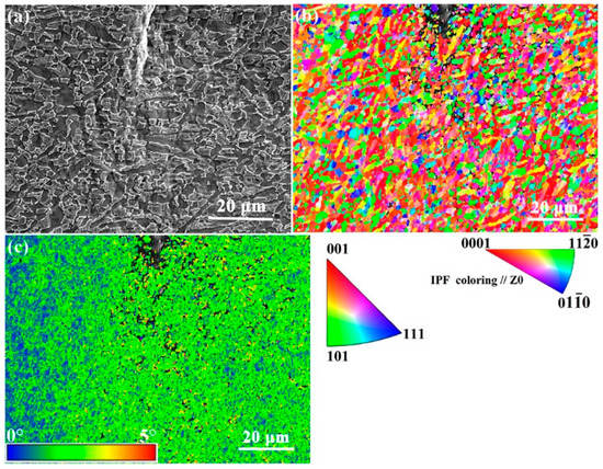 SEM images of crack tip in the Ti-54432 alloy with strain of 13.4% in the in-situ tensile test: (a) morphology; (b) inverse pole figure (IPF) map; and (c) Kernel average misorientation (KAM) map.