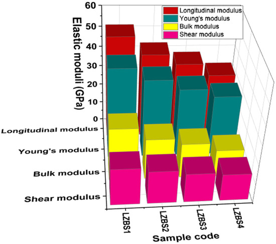 Trends in the longitudinal, Young’s, bulk, and shear moduli of the LZBS glass system.