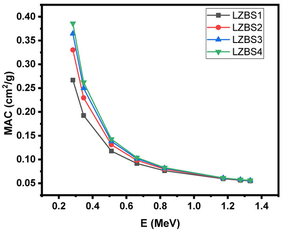 Figure 3 presents the graphical relationship between each mass attenuation coefficient (MAC) for the selected glasses and the energy. The energy was chosen within the range from 0.284 to 1.33 MeV, and theoretical calculations were performed using PSD software. Figure 3 shows that the MAC values depend heavily on the concentration of Bi2O3 as well as on the photon energy, as the MAC values for all glass samples decreased as the photon energy increased from 0.284 to 1.33 MeV, while the MAC value increased when SiO2 was replaced by Bi2O3. The LZBS1 sample contained the least amount of Bi2O3 (the highest concentration of SiO2) and, thus, had the lowest MAC, whereas the concentration of Bi2O3 increased from the LZBS1 sample to the LZBS4 sample, causing an increase in MAC values, with the highest value determined for the glass containing the highest percentage of Bi2O3. The reason for this increase is that the atomic number of Bi is higher than that of Si, so increasing the concentration of Bi2O3 improves the MAC value of the samples under study. Figure 3 also shows that the effect of Bi2O3 on MAC values was noticeably stronger at energies of 0.284 and 0.347 MeV and that the effect of Bi2O3 on MAC values became weaker as the energy increased. At 0.284 MeV, the MAC values of the LZBS1 and LZBS4 samples changed from 0.267 to 0.386 cm2/g (the difference was 0.119), whereas the difference in MAC values for the same two samples but at an energy level of 0.826 MeV was only 0.006. The reason for this is due to the photoelectric effect, which is very important at low energies, and it is well known that this effect depends inversely on energy and heavily depends on the atomic number [34]. As shown in Figure 3, the LZBS4 sample had the highest MAC.