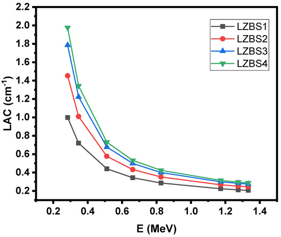 We also show the relationship between the linear attenuation coefficient (LAC) of the samples and energy (see Figure 4) to understand the effect of sample density on the efficiency of the samples in radiation shielding. We noticed an inverse relationship between LAC and energy, and this result is the same as in the previous figure, indicating that the radiation-shielding efficiency of glass samples is clearly dependent on the radiation energy. Therefore, if the samples are exposed to low-energy photons, the glass can prevent photons from penetrating it, and thus, the glass samples are effective in radiation protection; however, as the energy of the photons increases, the ability of the samples to attenuate the photons decreases, and their efficiency becomes low. In other words, glass is extremely effective at attenuating low-energy rays. Figure 4 shows that energy is not the only factor that influences the efficiency of glass in attenuating the photons; there is also the density of the glass to consider. As we mentioned when discussing the mechanical properties of these samples, changing the glass composition (by changing the concentrations of SiO2 and Bi2O3) causes a clear change in the density, which results in a noticeable change in the LAC values. For example, if we compare the LAC values for the lowest-density sample (LZBS1) and the highest-density sample (LZBS4), we notice that the value changes from 0.998 to 1.976 cm−1 (at an energy level of 0.284 MeV), from 0.720 to 1.343 cm−1 (at 0.347 MeV), and from 0.286 to 0.424 cm−1 (at 0.826 MeV). Thus, high-density samples have a positive effect on the shielding of materials, and the higher the density of the glass, the better the radiation-shielding effect. This figure emphasizes the significance of manufacturing high-density glass to obtain a material capable of effective radiation protection.