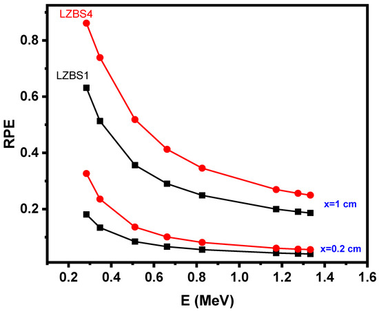 Trends in the radiation protection efficiency (RPE) of LZBS1 and LZBS4 glasses at 0.2 and 1 cm.