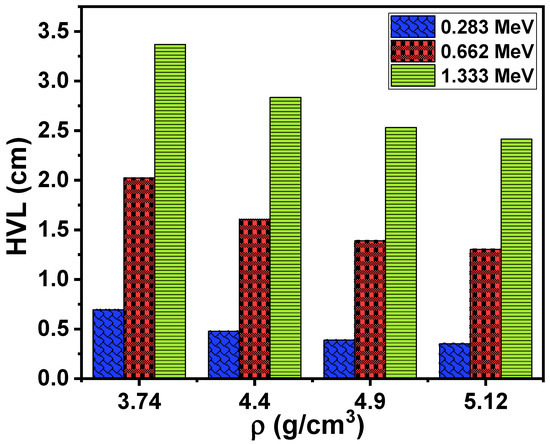 We calculated the half-value layer (HVL) to determine the effect of the composition of the samples as well as the density of the samples’ thicknesses required to attenuate 50% of the intensity of the original photons. The relationship between HVL and the density of the samples is displayed in Figure 6. We notice from the figure that the greater the increase in the energy of the photons, the greater the increase in the HVL. Accordingly, energy is considered the first factor that affects the thickness of the samples required to absorb 50% of the photons emitted by the radioactive source. Photons with low energy will require a thin sample of glass to become attenuated. For example, the HVL values in this study ranged between 0.351 and 0.694 cm at the lowest energy, and when the energy was increased to 0.662 MeV, the HVL values increased to a range between 1.302 and 2.022 cm. Energy is not the only factor that affects the HVL. In reviewing the HVL values of the glass samples at a certain energy, we notice that these values changed when the chemical composition of the samples changed (it changed with the change in density). We also notice that the LZBS1 sample had the highest HVL value and decreased with the addition of Bi2O3, reaching the lowest value for the sample that contained the highest concentration of Bi2O3, which means that adding Bi2O3 reduces the sample dimensions needed to attenuate the photons. Therefore, the use of glass samples containing a high concentration of Bi2O3 will be appropriate, as the dimensions of the samples are small in this case. The HVL ranged between 0.351 and 2.344 cm for the highest-density sample (LZBS4).