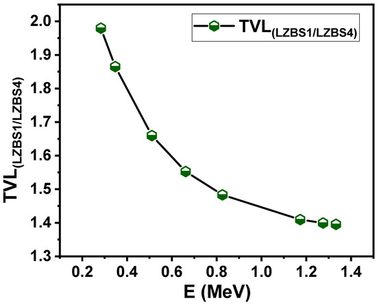 The tenth-value layer (TVL) value and the ratio between TVL for the LZBS1 and LZBS4 samples were calculated, and the results are presented in Figure 7. The aforementioned samples were chosen because they contained the lowest and the highest concentrations of Bi2O3. From Figure 7, we notice that the ratio is higher than 1, which is true at all energies, which means that the TVL value of the LZBS1 sample is higher than that of the LZBS4 sample. This result agrees with the previous figure and emphasizes the importance of using Bi2O3 to improve the radiation-shielding properties of the prepared glass. We also note that the ratio was highest at the first energy (1.97), and it began to decrease as the energy increased; then, it decreased to 1.86 at an energy of 0.347 MeV, decreased again to 1.66 at an energy of 0.511 MeV, and continued to decrease to 1.55 at an energy of 0.662 MeV until it reached its lowest value of 1.39 at an energy of 1.33 MeV.