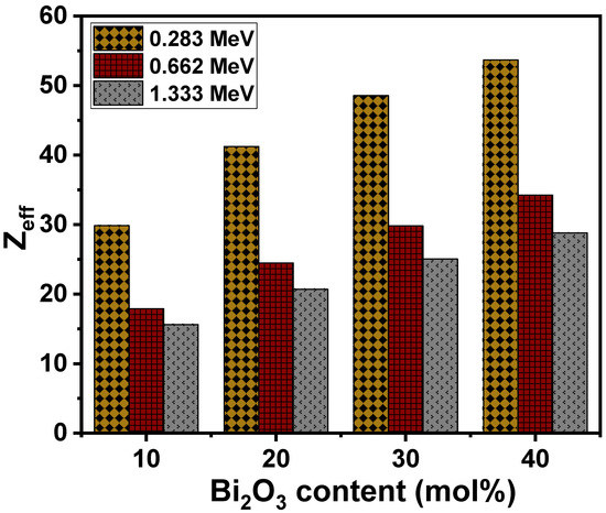In Figure 8, the effective atomic number (Zeff) of the glasses is shown for the lowest and highest energies of 0.283 and 1.333 MeV used in this study. It is observed that Zeff declined as the energy increased. The value of Zeff was between 29.86 and 53.69 for the LZBS1 and LZBS4 samples at 0.283 MeV, and at 1.333 MeV, the values ranged from 15.62 to 28.82. This is due to the interplay of the photoelectric effect and Compton scattering. Moreover, Zeff gradually increased as Bi2O3 content increased from 10 to 40 mol% for a given energy. This indicates a higher photon-interaction probability at higher concentrations of Bi2O3. The observation that the LZBS4 glass had the highest Zeff values at a given energy implies that it is more able to block the incident radiation when compared with glasses with lower contents of Bi2O3.