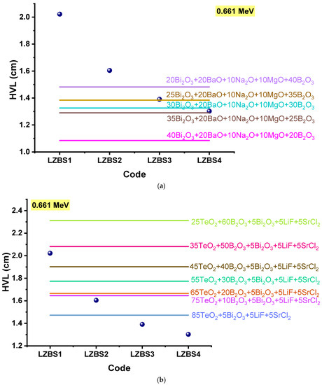 A comparison of the HVLs of the LZBS glasses with those of other glasses containing Bi2O3 is shown in Figure 9a–c.
