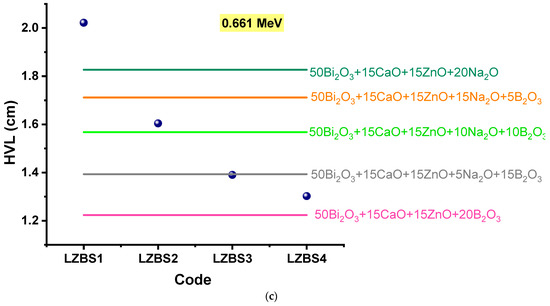 (a) Comparison of the HVL of the LZBS glasses with that of the Bi2O3-BaO-Na2O-MgO-B2O3 glass system [35]. (b) Comparison of the HVL of the LZBS glass system with that of the TeO2-B2O3-Bi2O3-LiF-SrCl2 glass system [36]. (c) Comparison of the HVL of the LZBS glass system with that of the Bi2O3-CaO-ZnO-Na2O-B2O3 glass system [23].