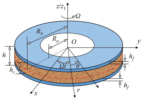 Due to the spinning effect, the disk is always subjected to aerodynamic loading on its faces. To enhance structural stiffness and reduce weight, a sandwich annular plate structure could be designed in which the upper and lower faces are made of uniform solid metal and the core is porous foamed metal. Because the pores can weaken the structural stiffness, some reinforcements need to be added. GPLs, owing to their superior mechanical properties, are well suited to be the reinforcements. Recently, the vibration behavior of GPL reinforced structures for better mechanical performance has been a topic of extensive research efforts [16,17,18,19,20]. Yang and Zhao et al. [21,22,23,24] carried out extensive research on the free vibration of rotor structures reinforced by GPLs. Based on the modified couple stress theory, Adab et al. [25] studied the free vibration of a spinning sandwich micro-shell. Saidi et al. [26] investigated vibrations of an FG porous GPL reinforced plate subjected to aerodynamical loading. Li et al. [27] studied nonlinear vibrations of a sandwich FG porous GPL reinforced plate resting on Winker–Pasternak elastic foundation. Zhou et al. [28] investigated vibrations of a GPL reinforced porous cylindrical panel under supersonic flow. Gao et al. [29] conducted nonlinear free vibration analysis of a porous plate reinforced with GPLs. Baghlani et al. [30] studied uncertainty propagation in free vibration of an FG porous shell with GPL reinforcement. Anamagh et al. [31] developed a spectral-Chebyshev approach to study vibrations of an FG porous plate reinforced with GPLs. Based on a trigonometric shear deformation theory, Anirudh et al. [32] discussed the vibration behavior of a GPL reinforced FG porous beam.