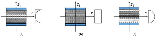 Porosity distribution patterns for the core of the annular plate. (a) Pattern XP; (b) Pattern UP; (c) Pattern OP.