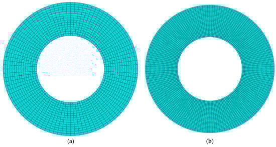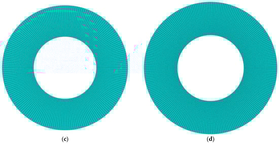 The finite element method is used to validate the present analysis by using commercial software ABAQUS. The functionally graded material core is divided into ten layers and the material properties of each layer are calculated by the equations in Section 2.2. The annular plate is clamped at the inner edge, free at its outer edge, and is discretized by 4-node doubly curved general-purpose shell elements with 6 degrees of freedom. To examine the convergence of the finite element analysis, Table 3 gives the first four natural frequencies at Ω = 500 rad/s with different total numbers of elements Ne = (1440, 4000, 5760, 7840) and nodes (1536, 4160, 5952, 8064). Figure 4 displays the corresponding mesh graphs. It is clear that the free vibration results come to be converged at element number Ne = 7840.