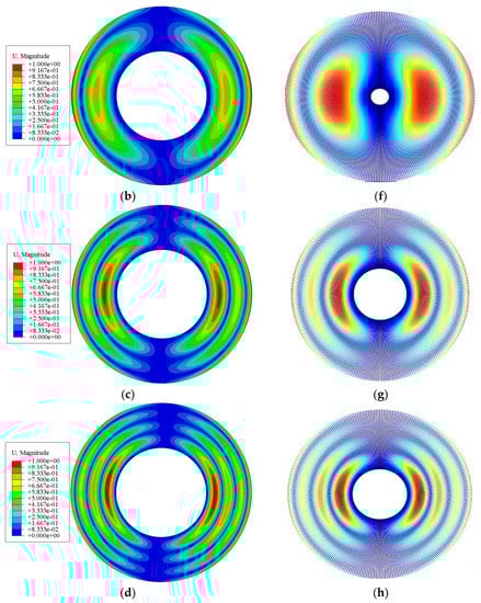 Vibration modes of the spinning annular plate: (a–d) are the first four vibration modes obtained by ABAQUS; (e–h) are the first four vibration modes obtained by MATLAB.