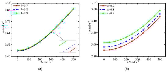 Since the variations of natural frequencies with spinning speed are similar, only two typical spinning speeds, 0 rad/s and 500 rad/s, are adopted in the following analysis.
