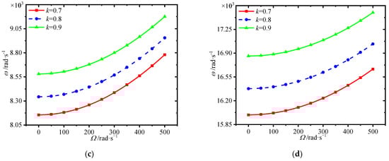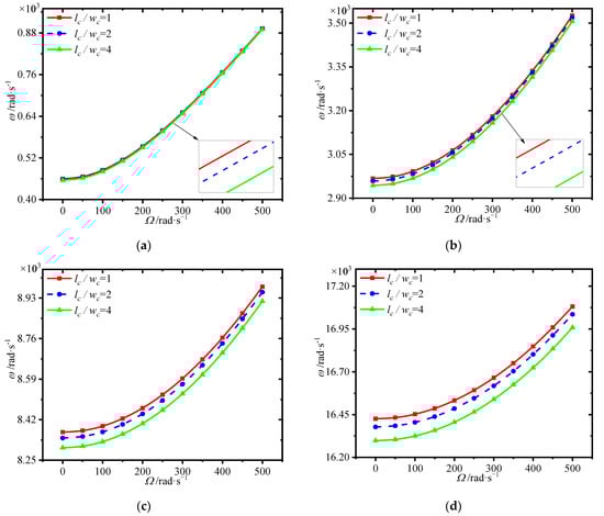 Variations of first four natural frequencies (rad/s) with GPL length-to-width ratio for different spinning speeds. (a) first frequency (b) second frequency, (c) third frequency (d) fourth frequency.