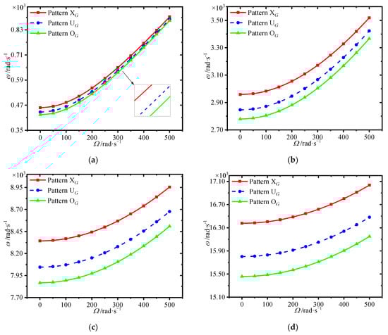 Figure 7 plots the variations of first four natural frequencies of the annular plate with spinning speed for different GPL distributions. It is seen that the GPL distribution pattern XG provides highest frequencies, while pattern OG has the worst enhancement effect. This implies that dispersing more GPLs around the surfaces of the core could give a hand to enhance the structural stiffness.