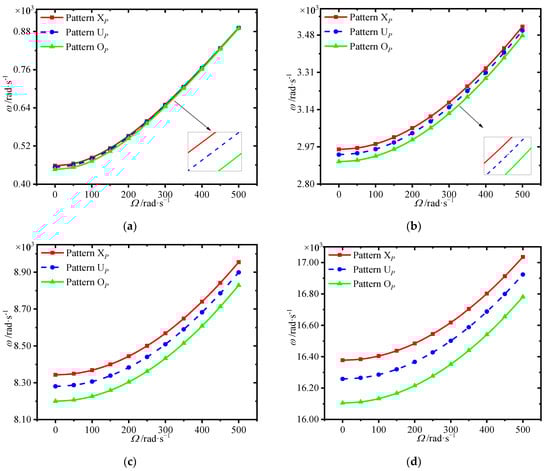 The variations of first four natural frequencies of the annular plate with spinning speed for different porosity distributions are presented in Figure 8. Results show that porosity distribution pattern XP affords greatest frequencies, while the pattern OP gives the smallest one. It is noted that setting more pores around the surfaces of the core is effective to obtain great mechanical performance.