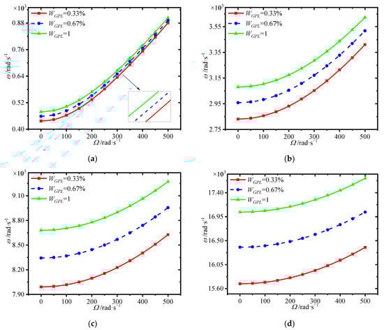Variations of first four natural frequencies (rad/s) with GPL weight fraction for different spinning speeds. (a) first frequency (b) second frequency, (c) third frequency (d) fourth frequency.
