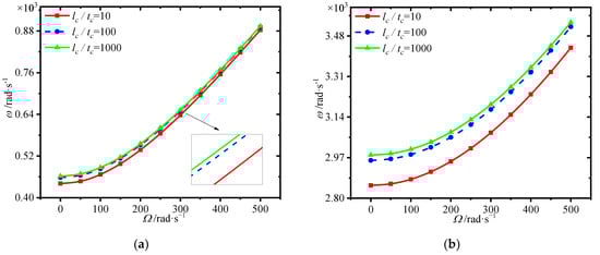 Figure 10 lists the variations of first four natural frequencies of the annular plate with GPL length-to-thickness ratio at different spinning speeds. We can see that the frequencies rise dramatically with the GPL length-to-thickness ratio. For the same content of GPLs, larger GPL length-to-thickness ratio means a thinner GPL. It can be seen that better enhancement effect occurs when thinner GPLs are added into the core.