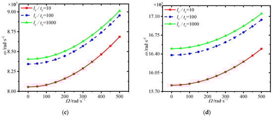 Variations of first four natural frequencies (rad/s) with GPL length-to-thickness ratio for different spinning speeds. (a) first frequency (b) second frequency, (c) third frequency (d) fourth frequency.