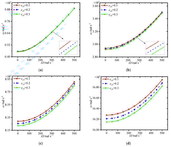 The variations of first four natural frequencies of the annular plate with porosity coefficient at different spinning speeds is presented in Figure 12. One can see that the frequencies decrease in general with the increase of porosity coefficient. Although the larger porosity coefficient can result in light weight, it weakens the structural stiffness.