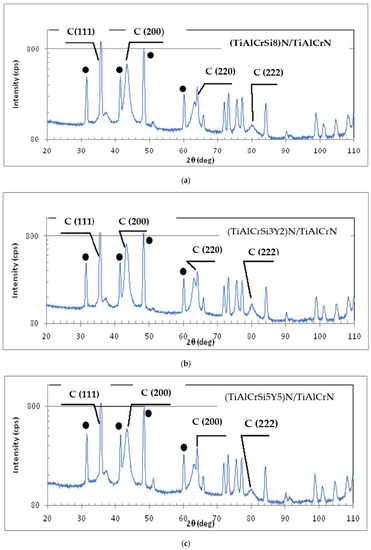 Black circle labels on the peaks signify the contribution from the carbide substrate. Although a precise XRD analysis was performed, WC-Co substrate signals could also be detected in the studied multilayer coatings with a thickness of 2 μm. Apart from the substrate contribution, the as-deposited coatings feature diffraction peaks that correspond to an fcc NaCl-type structure [35]. Individual intense peaks for fcc CrN (JCPCD 76-2494), Cr2N (JCPCD 35-0803), hep-AIN (JCPCD 25-1133), and fcc AIN listed in the database (JCPCD 25-1495) [36] were not found. The TiN, AlN, and CrN reflections became superimposed, generating wide lines near 37°, 63°, and 43°, respectively, signifying the formation of a solid solution [37]. Most of the reflections indicated a single-phase B1 FCC lattice structure in TiAlCrSiYN/TiAlCrN. The study of line intensities (111) and (200) is of particular interest. The intensity of the (111) line is greater than that of the (200) line, which differs from most of the results obtained during XRD investigations of TiAlCrN-based coatings [38,39]. One of the factors contributing to the high intensity of the C (111) line compared to that of the C (200) line may be the texture of the coatings. In highly alloyed and heavily stressed coatings, the strain energy can lead to texture growth. The lowest strain energy becomes the main driving force behind the preferred growth orientation [40]. In this case, the lattice plane with minimal elastic modulus will be oriented in parallel with the substrate. In Bl FCC structures, this corresponds to the (111) plane. It is very likely that the formation of TiAlCrSiYN/TiAlCrN coatings is governed by the strain energy. Another factor determining the high intensity of the (111) line is the presence of atoms with a high X-ray scattering factor in the cubic plane (111). It was found earlier that if the titanium content increases from 17 to 46 at.% and the aluminum content decreases from 53 at.% to 20 at.% in TiAlCrN-based coatings, the intensity of the (200) line grows significantly in comparison with the (111) line. The inclusion of up to 3 at.% Si reduces the intensity of the (200) line by an order of magnitude [41,42]. In nonstoichiometric (TiAlCrSiY) nitride coatings, the total amounts of Si + Y additives were 5.0, 8.0, and 10.0 at.%, which resulted in an increase in the C (111) diffraction line’s intensity compared with that of the (200) line by 1.3, 1.4, and 1.5 times, respectively. Atomic scattering coefficients of Y, Si, and Ti correspond to the values of 19.0, 6.1, and 9.5 under the selected XRD analysis conditions [43]. When the complex nitride was modified it is likely that the Si and Y atoms replaced the Ti atoms in the (111) planes.