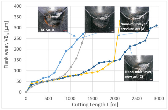 Figure 2 presents flank wear vs. length of cut data. The newly developed Ti0.18Al0.55Cr0.17Si0.05Y0.05N/Ti0.25Al0.65Cr0.1N bi-nano-multilayer coating (coating C) has a 2.08 times longer tool life than the industrial benchmark Al0.6Ti0.4N (KC 5010) and the tool life of the Ti0.2Al0.52Cr0.2Si0.08N/Ti0.25Al0.65Cr0.1N bi-nano-multilayer coating with increased Si content (coating B) and is 40% longer than that of the Ti0.2Al0.55Cr0.2Si0.03Y0.02N/Ti0.25Al0.65Cr0.1N bi-nano-multilayer coating (coating A). Optical microscopy images show a clear difference in the wear patterns. Intensive crater wear is typical in all of the studied coatings with the exception of the newly developed coating C. The intensity of buildup edge formation is also diminished in this coating.