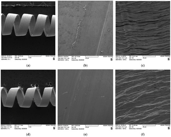 Figure 3 displays the following chip characteristics: (a) chip type, (b) undersurface morphology, and (c) shear band lines on the upper surface of the chips formed by the coated tools. The chips produced by the tool with the new coating C have superior curling (Figure 3a–d) and a smoother undersurface morphology compared to the previous state-of-the-art coating A (Figure 3b–e). Additionally, the segments of each compared chip are curved in a slightly different manner (Figure 3c–f). The chips produced by tools with coatings A and C have a regular lamellar structure. However, chips produced by the new coating C (Figure 3f) indicate the presence of milder friction conditions at the tool/chip interface. Conversely, discontinuous and brittle shear bands were observed in the chips produced by the tool with the previous coating A (Figure 3c). This is less prominent in the tool with the new coating C (Figure 3f).