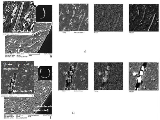 SEM images of the chips’ cross-sections presented in Figure 4 also indicate a significant difference in the tribological behavior of the studied coatings. Chips produced by the tool with coating C have a significantly thinner and curlier shape (Figure 4a,b), which is directly related to the tribological performance of the coated tool. The low thermal conductivity of Inconel DA 718 alloy leads to a very strong heat concentration at the tool/chip interface, causing intensive metal flow in this area [47]. This process is more intense in the chips formed by the tool with the new coating C. It can be concluded from the chip’s characteristics that the surface of the tool with the new coating C is better protected (see details below). This results in a beneficial heat redistribution because more heat is redirected into the chip, which softens the chip/tool interface [50]. The load on the surface is decreased, but the temperature rises at the interface (Figure 4). Moreover, due to the high temperature at the interface, initial stages of transformation from NbC to Nb-rich Laves phases, typical for high-speed Inconel machining [50], most likely occur within the layer of this chip [50,51]. Intensive deformation twinning was observed in the Nb carbides within the chips generated by the tool with coating A (Figure 4a). It is known that the Laves phases are very brittle [52,53]. Therefore, this phase formation (even during the initial stage) promotes crack formation and leads to the intensive fracture of the hard Nb-based phase during the cutting process (Figure 4b) [41]. This accounts for the lower amount of carbides (Figure 4b) at the chip/tool interface, where the temperature is particularly high. Therefore, metal flow within the chip was strongly enhanced in the tool with coating C.
