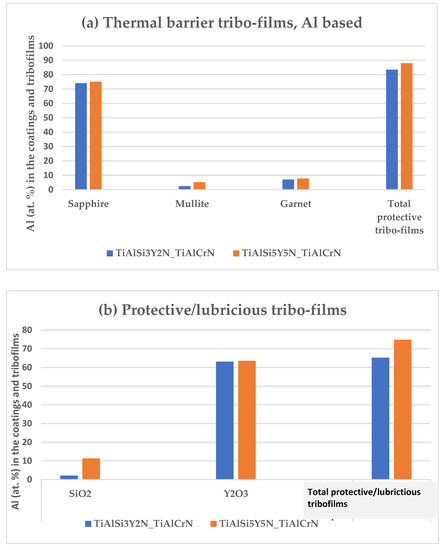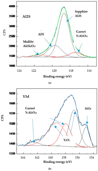 As was outlined above, this difference in tribological performance is directly associated with the formation of tribo-films on the friction surface. XPS data of the worn surface show that several types of tribo-films are generated during friction (Figure 5): (1) thermal barriers: Al2O3 sapphire, Al6 Si2O13 mullite, and Y3Al5O12 garnet; (2) thermal barrier/lubricating: Y2O3, SiO2.