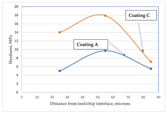 This beneficial behavior of the chips directly corresponds to the formation of thermal barrier tribo-films on the cutting tool rake surface (see Figure 5 and Figure 6). The thermal barrier layer of the tribo-films decreases the heat flow from the cutting zone toward the tool surface [26]. A greater amount of heat is thus transferred into the chips, softening the surface area (Figure 7). On the other hand, the chips produced by coating C are accompanied by a very intense metal flow (due to a lower coefficient of friction during cutting; Table 3), resulting in the formation of strain-induced martensite zones (Figure 4b) within the surface area of the chips [29], which is a self-organization process [54]. One of the major features of Inconel DA 718 machining is its tendency to work harden at high operating temperatures [55,56]. If the chips produced by the tool with coating C are compared with those produced by the tool with coating A, it can be found that the increased hardness of the surface layer of the chips produced by the tool with coating C reduces the adhesion of the workpiece material to the tool surface. This, in turn, results in the formation of curlier chips (Figure 4b), which directly corresponds to superior wear performance.