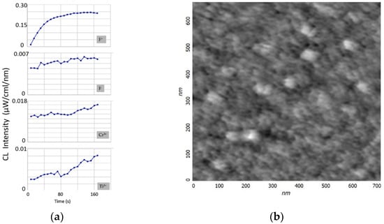 Figure 6) of an A-plane sapphire sample with gold nanocrystals was studied. For a correct comparison with a pure A-plane sapphire sample without gold, the same beam parameters were used—electron energy of 40 keV and a spot diameter of 0.5 mm. The intensity of the F