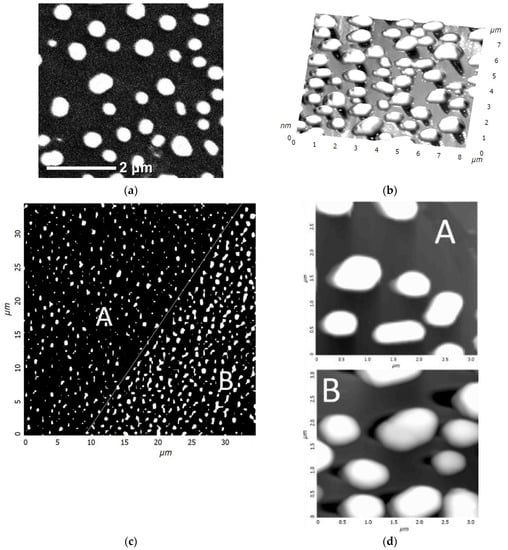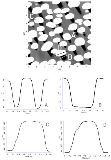 Figure 3c,d) between the areas of treated and untreated electrons. First of all, an increase in the size of nanocrystals was noticeable. A distinctive feature of the etch pits (