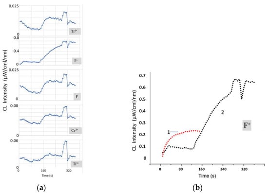 Figure 6a). The positions of their features on the time dependence coincided with the positions of the other bands, but there were also differences. Note that the F and Ti