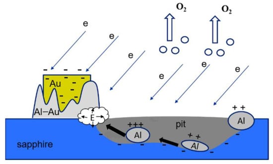 In the case of oxygen desorption, the outflow of positively charged aluminum atoms to negatively charged gold crystals can accelerate the decomposition (etching) of the sapphire surface. In addition, there have been recent studies [