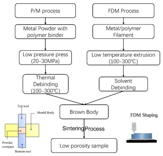 Since the FDM specimen is in a loosely packed state, robust aluminum alloy parts can be made with the FDM method only with optimized processing control. In this paper, considering the metal-based FDM process shares many commonalities with the classical pressing and sintering-based P/M process—including raw materials mixing, extrusion/consolidation, and controlled sintering (Figure 1)—the classical pressing and sintering-based P/M method is explored to investigate the feasibility of making Al7075 parts using the FDM process. To mimic the FDM processed green-bodies, which contain high levels of metallic powders and polymer binders, Al7075 powders and polymer binders are first mixed and consolidated with low pressure. We utilized wet-mixing of polymer binder with Al7075 powders to achieve good mixing. In the powder injection molding (PIM) industry, the mixed polymer consists of backbone, filler, and lubricant. Then, thermal debinding is performed to remove a portion of the binder before the sintering step. Alloys suitable for producing high-quality metallic FDM AM parts (not limited to Al7075) and the relevant processing windows can be rapidly screened with the P/M-based specimen preparation method presented in this paper.
