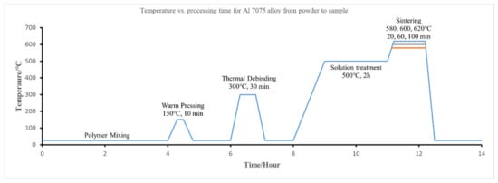The typical temperature profile for making FDM-like bulk Al7075 specimens with the classical pressing and sintering-based P/M method.