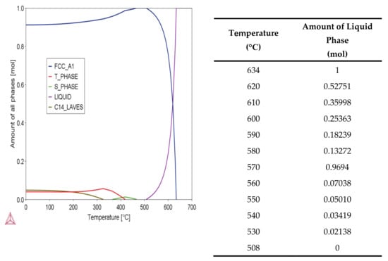 Pore filling is an essential densification mechanism in the sintering of aluminum alloys [24] for which liquid phase sintering (LPS) is necessary. The amount of liquid phase in a typical LPS system is 5–30% [25]. We utilized Thermo-Calc software to calculate the phase diagram, Figure 7, to identify the amount of liquid phase present at different temperatures for the Al7075 alloy. Considering the presence of a large number of pores in the loosely packed specimens, 580 °C (13 vol % liquid phase), 600 °C (25 vol % liquid phase), and 620 °C (53 vol % liquid phase) were adapted as the sintering temperatures to test the sintering behavior of the Al7075 specimens, as seen in Table 3.