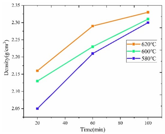 The first set of sintering tests under the so-called standard sintering strategy was conducted under vacuum. Figure 8 illustrates the variation of density achieved for the sintered specimens with the range of sintering temperature. The density of the specimens improves by increasing either the sintering temperature or the sintering time. In the first stage of the study, the highest specimen density was 2.33 g/cm3 (620 °C, 100 min). Considering that the theoretical density of Al7075 is 2.81 g/cm3, the highest relative density was around 83%, indicating that even after 100 min of sintering at 620 °C with theoretical 53 vol % liquid content, the FDM Al7075 specimen remained in the early stages of sintering.