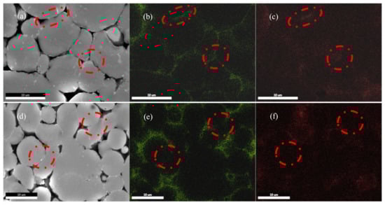 EDS Mapping of sintered specimens. (a) 580 °C, 100 min. (b) O. (c) Mg. (d) 620 °C, 100 min. (e) O. (f) Mg.