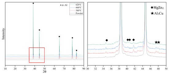 Figure 13 shows the XRD patterns of sintered Al7075 alloy specimens (where sintering time was 100 min). The major secondary phases in all the sintered specimens are MgZn2 and Al2Cu. Reference [31] pointed out that the formation enthalpy (ΔH) decreases in the order MgZn2 > Al2Cu, whereas the binding energy (Eb) decreases in the order Al2Cu > MgZn2. The formation of MgZn2 can be promoted by increasing the content of Zinc or decreasing the content of magnesium. In a low liquid phase fraction sintering process (580 °C), even in the particle contact area, it is difficult for the liquid phase inside the particles to wet the oxide film and promote the magnesium and Al2O3 layer reaction. The content of magnesium in the matrix remains almost unchanged. In a high liquid phase fraction sintering process (620 °C), the reaction of the magnesium with the oxide film consumes the magnesium in the matrix, which drives the formation of MgZn2. In the 620 °C specimen XRD patterns, Al2Cu peaks disappeared, and only MgZn2 was detected, which is consistent with the results obtained from the theoretical model.