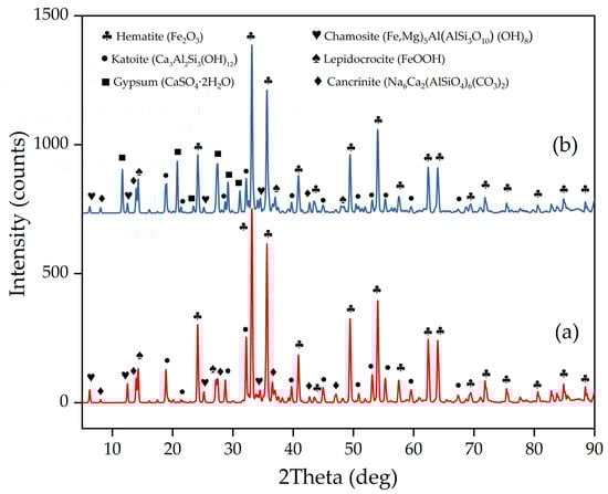 Figure 1a shows the XRD pattern of the raw RM-ESPD. As can be seen, the raw red mud consists of hematite (Fe2O3), katoite (Ca3Al2Si3(OH)12), chamosite ((Fe,Mg)5Al(AlSi3O10)(OH)8), lepidocrocite (FeO(OH)), and a low amount of cancrinite (Na6Ca2(AlSiO4)6(CO3)2). This mineral composition is close to that of the Bayer RM [,,]. However, the amount of cancrinite is higher in the industrial RM and there is no lepidocrocite. A low amount of cancrinite can be attributed to the fact that Na2SiO3 was dissolved from ESPD by water before Al extraction. Lepidocrocite was formed via the water leaching of the dust that contained sodium ferrite formed during the sintering of bauxite with soda (Na2CO3). However, ESPD passes very quickly through the hot zones of the furnace, and the reaction of hematite with soda fails to complete. Therefore, the main iron mineral in the RM-ESPD is hematite. It was confirmed by the semi-quantitative analysis performed via Rietveld methods (Table 1).