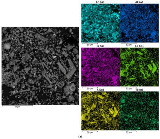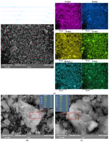 The high concentration of iron and the association of Ca and Na with aluminosilicates in the RM-ESPD was confirmed by SEM-EDS mapping (Figure 2a). However, grains that mainly consist of Ca oxides are depicted in Figure 2a. They can be represented by unreacted calcite. According to mineralogical composition (Figure 1 and Table 1), the most abandon iron mineral in this type of RM is hematite with a low amount of iron hydroxide. Figure 2b,c shows that hematite particles are covered by DSP (cancrinite and katoite—aluminum containing minerals).