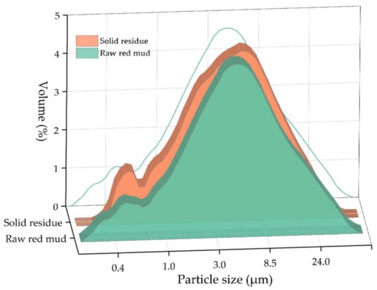 Particle size distribution (PSD) of the RM-ESPD and solid residue after MgSO4 leaching (green line is the projection of the raw red mud PSD on the ZY plane).
