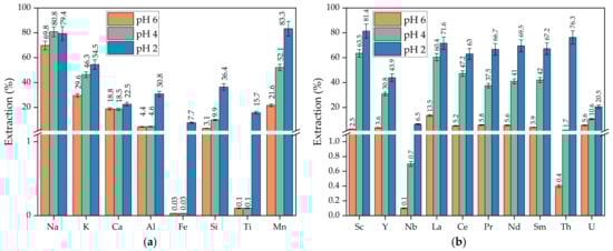 Effect of pH at a temperature of 80 °C, leaching time of 60 min, L/S ratio of 10:1, and MgSO4 concentration of 24 g L−1 on: (a) the extraction of major elements; (b) the extraction of minor elements.