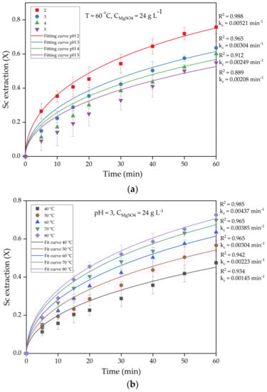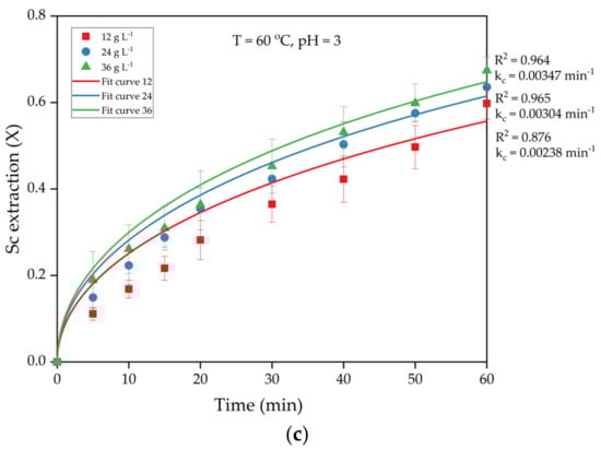 With an increase in temperature from 40 °C to 80 °C, Sc extraction increased from 47.5% to 72.5%, after 60 min of leaching at a pH of 3 (Figure 5b). At the same time, the extraction of Sc increased by about 54% with an increase in time from 5 to 60 min at 80 °C. The lower effect of temperature can be attributed to diffusion as a limiting stage of the process. To enhance the acid leaching process limited by diffusion, the concentration of the free reagent in the solution should be increased. An increase in H+ concentration obviously increases the extraction rate, as can be seen in Figure 5a. However, an increase in MgSO4 concentration (Figure 5c), does not lead to a significant Sc extraction increase. With an increase in MgSO4 concentration from 12 g L−1 to 36 g L−1, Sc extraction increased from 59.8% to 67.4% after 60 min of leaching, at a pH of 3 and temperature of 60 °C, and almost no difference between results at 24 g L−1 and 36 g L−1 MgSO4 concentrations was seen. It implies that not external but intraparticle diffusion can be the limiting stage of the process. To evaluate this, a kinetics study was conducted.