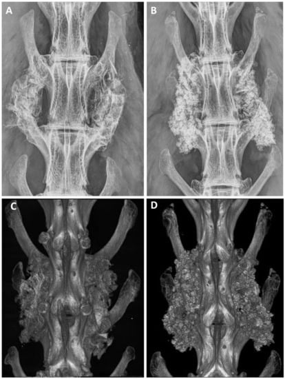For all animals, post-sacrifice, faxitron and digital plates (AGFA CR MD4.0 Cassette) were used to radiograph the extracted spines (32 kV, 25 s), and micro-CT (Inveon, Siemens Medical, Malvern, PA, USA) was used to obtain high-resolution (40 µm) images of the spinal fusions in three planes (axial, coronal, and sagittal). The digital photos were processed using an AGFA Digital Developer and workstation (AGFA CR 75.0 Digitiser Musica, AGFA, Germany). Medical viewer ezDICOM was used to convert DICOM data. Analysis of the Faxitron radiographs and micro-CT was conducted in a blinded manner by two independent observers in the posteroanterior and in the coronal, axial, and sagittal planes to assess the quality of the fusion between the two transverse processes using the Lenke four-point grading scale [29]. A grade of A was assigned to a fusion that was determined to be solid, with a bilateral strong bridging bone. A fusion that was assessed to be likely solid with a unilateral strong bridging bone and a contralateral thin fusion mass received a grade B. A fusion that was assessed to be likely not solid with a thin unilateral fusion mass and possible pseudarthrosis on the contralateral side received a grade C. A fusion that was assessed to be obviously not solid with thin fusion masses bilaterally and apparent pseudarthrosis or bone graft disintegration received a grade D. Based on film evaluation, the proportion of successful fusions for each grade was determined.