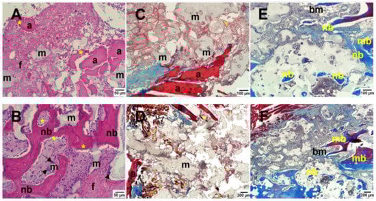 H&E staining of the transverse processes at (A) 3 days and (B) 12 weeks shows that granules released by BCP-EP are in direct contact with cells, including multinucleated cells (black arrow) and extracellular matrix. Osteoblasts (yellow asterisks) were observed to deposit new bone matrix. Tetrachrome staining at (C,D) 3 days and (E,F) 12 weeks showed the progressive formation and maturation of novel bone and bone marrow spaces. No adverse reaction was noted. Legend: m: calcium phosphate material; a: autograft particles; b: bone; nb: new bone; mb: mature bone; f: fibrous tissue; bm: bone marrow.