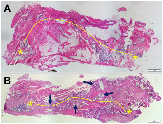 Overview of the histological panels (H&E) of the fusion masses present in the spine of (A) ABG and (B) BCP-EP/ABG at 12 weeks after surgery. Both fusion masses were evaluated as fused since a continuous bone mass (yellow line) was present between the transverse processes (yellow asterisk). The presence of BCP granules in the newly formed bone was confirmed in the BCP-EP/ABG group (black arrows).