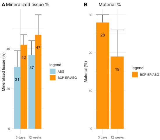 Graphs of the histomorphometrical analysis after 3 days and 12 weeks of implantation of ABG (light blue) or BCP-EP/ABG (orange): (A) mineral tissue percentage and (B) material resorption. Mineralized tissue increased overtime and resorption of BCP-EP was observed. Data are shown as mean ± sd. No statistical difference was observed between ABG and BCP-EP/ABG at week 12.