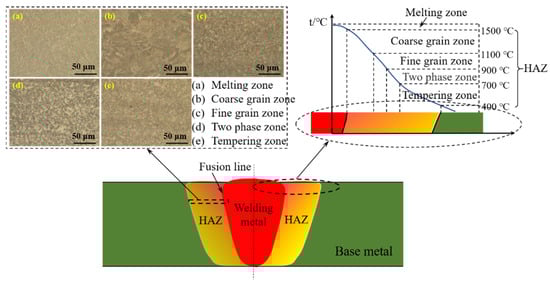 The welding HAZ is a whole zone where the structure and properties of the unmelted base metal on both sides of the weld fusion line change under the conditions of the thermal cycle. The microstructure and temperature range of HAZ in high strength steel are shown in Figure 1. According to the distance from the weld center, it is divided into a melting zone, coarse grain zone, fine grain zone, two phase zone, and tempering zone, and the corresponding microstructure and temperature range are also shown. The coarse grain zone has large grains and poor toughness, so it is the weak zone of the HAZ and of entire welded joint. In addition, chemical composition, austenite grain size, and cooling speed are identified as the major factors that affect the microstructure and properties of HAZ [,].
