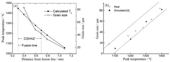 Peak temperature and austenite grain size of HAZ in HSLA-100 steel. (a) The relationship of peak temperature and distance from fusion line; (b) the relationship of grain size and peak temperature. (Reproduced with permission from []. Copyright 2007 Elsevier Publications.)